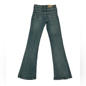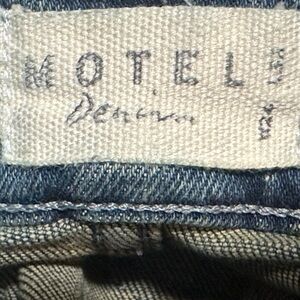 Indigo denim pants by Motel Rocks. Features a metal button and zipper. Stylish and versatile.