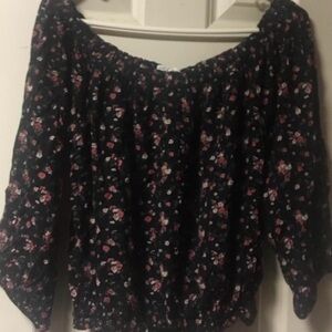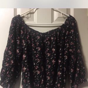Aeropostale blouse for women, size Large. Featuring a floral pattern in black and multi-colored hues, long sleeves, and a pullover closure. Made of a lightweight cotton blend material, suitable for winter, fall, and spring seasons. This bohemian-inspired top is perfect for travel, parties, casual outings, workwear, or business attire. In excellent condition.