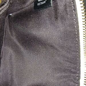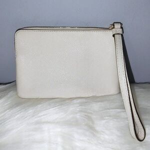 Elegant Coach wristlet in cream. Features textured design and secure zipper closure. Perfect for any occasion.