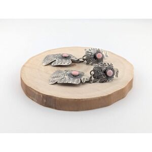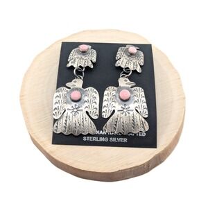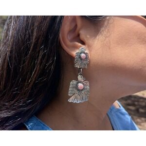 Handmade Navajo Sterling Silver Signed Earrings Thunderbird w Pink Conch Shell *
