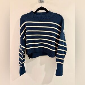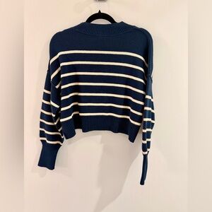 So classic in stripes, this forever essential pullover sweater is featured in a slouchy, cropped silhouette and ribbed knit fabrication with mock neckline, defined seaming, and slightly exaggerated sleeves for added shape.