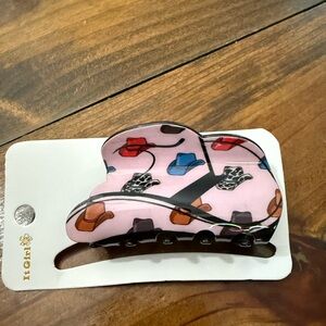 Stylish pink hair clip featuring a colorful boot print. Perfect for adding a fun touch to your hairstyle. Measures approximately 4in long, brand new!