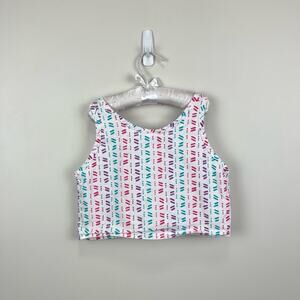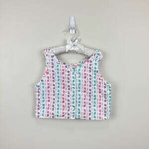 Vintage Stone Apparel Girls Crop Top. Girls size 10. USA made. Sleeveless white shirt with fun pink, purple, and aqua print. Buttons down the front. So cute paired with cut off jean shorts!