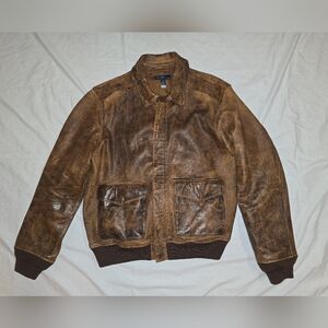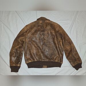 Stylish brown leather flight jacket with a rugged and distressed military design. Features front pockets and a classic collar.