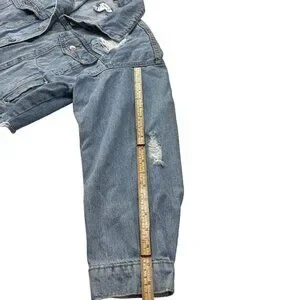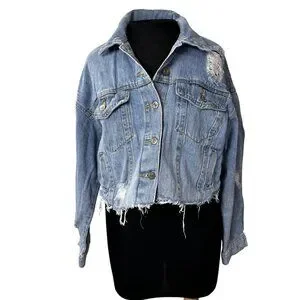 This distressed denim jacket features a modern cropped design with a frayed hem, offering a stylish touch to casual outfits. The light wash and intentional distressing provide a timeless, edgy appeal, making it an excellent addition to versatile wardrobes.