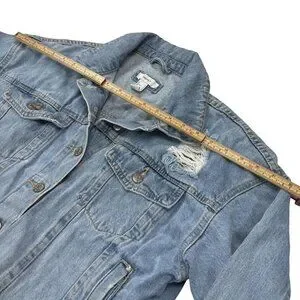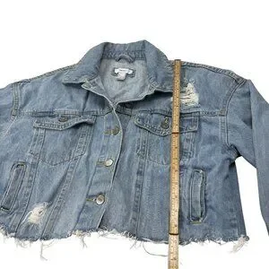 Forever 21 Distressed Cropped Denim Jacket Medium Light Wash Frayed Hem Womens