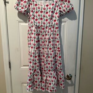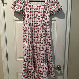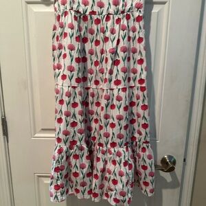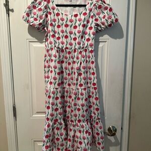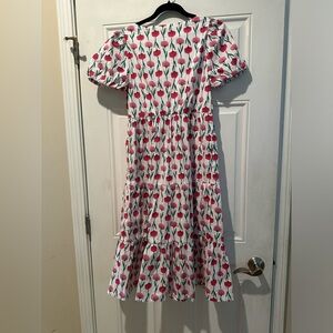 Charming floral maxi dress by J. Crew. Features a vibrant red and pink pattern. Puff sleeves add elegance. Perfect for any occasion.