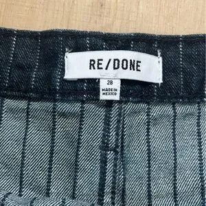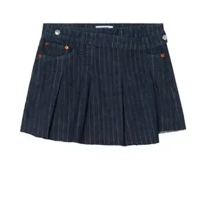 This RE/DONE skirt is crafted from heavyweight, non-stretch denim with a pinstripe pattern. It features a wrap design with snaps at the waist, a pleated skirt, 5-pocket styling, and a frayed hem. The shell is made of 100% cotton.