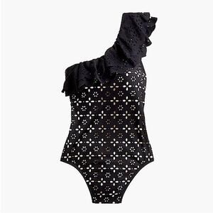 J.Crew Scalloped Ruffle One-Shoulder One Piece Swimsuit in Black Laser Cut Eyelet. Women’s Size 10. Good preowned condition. Smoke free home. Retail $128.