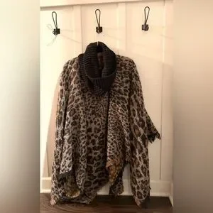 Elevate your style with this chic leopard print poncho. Featuring a cozy black collar, it's perfect for adding a touch of wild elegance to your wardrobe.