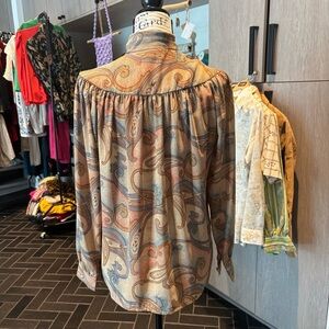 Gorgeous 70s/80s vintage paisley blouse with a chic tie-neck bow. Features soft gathers at the shoulders and back, button front closure, and long sleeves with button cuffs. Lightweight polyester with a beautiful neutral + muted pastel color palette (beige, peach, tan, and soft blue).