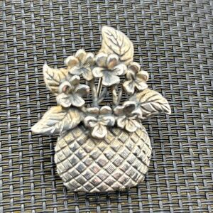 This lovely sterling silver pin by Newport, Rhode Island jewelry artist James H. Breakell, comes in its original box, and is sure to brighten the day of anyone who wears it. The pin is beautifully detailed, from the basket weave to the veins on the individual leaves. Measures 1-1/2 inches tall by 1-1/4 inches wide. The back of the pin is signed "JHB" with the artist's mark, and is also marked ".925" on the back of one of the leaves. Wonderful piece of jewelry suitable for many occasions.