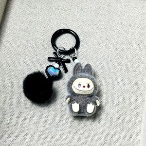 Fuzzy Have a Seat Black Labubu Keychain with Heart Gems Pom Pom Bag Charms NEW