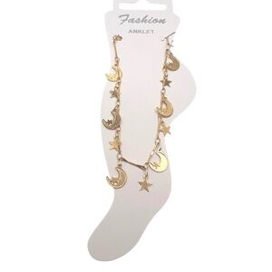 Shimmer with elegance wearing this gold moon and star anklet. Perfect for adding a celestial touch to any outfit.