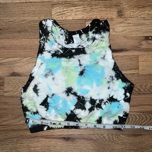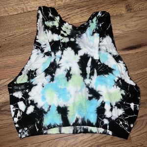 Stylish tie-dye sports bra. Features a blend of black, blue, green, and white. Comfortable and supportive.