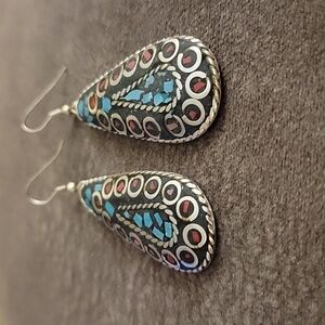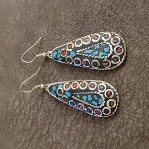 Tibetan Silver Turquoise Coral Mosaic Teardrop Dangle Festival Earrings