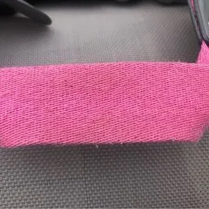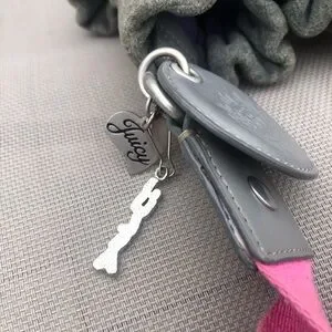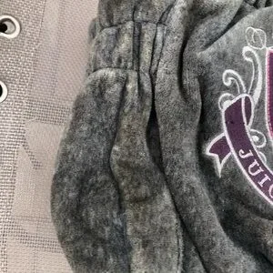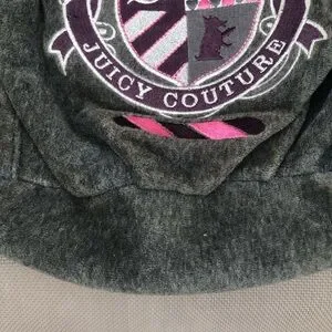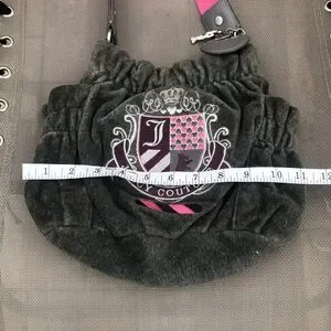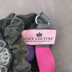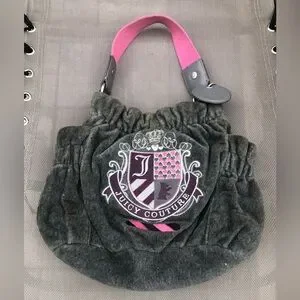 Stylish Juicy Couture bag. Gray fabric with pink strap. Features bold emblem design. Has some discoloration up close but still looks good on the whole for it’s age.
