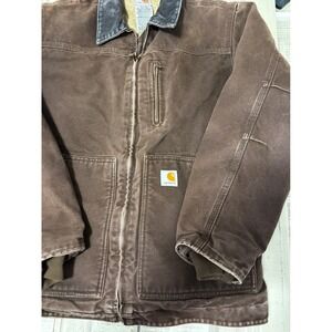 Embrace rugged durability and timeless style with this Carhartt work jacket. Crafted from robust canvas, this piece offers exceptional warmth and protection thanks to its plush sherpa lining. The classic brown hue and practical design make it a versatile addition to any wardrobe, perfect for chilly outdoor adventures or casual everyday wear. Whether you're heading to a weekend farmers market or braving a brisk commute, this jacket delivers reliable comfort and iconic Carhartt craftsmanship.