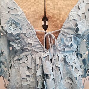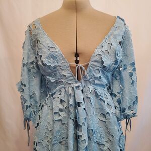Storia Medium Dress Blue Lace Mini Plunge Neckline Balloon Sleeve Cut-out Back