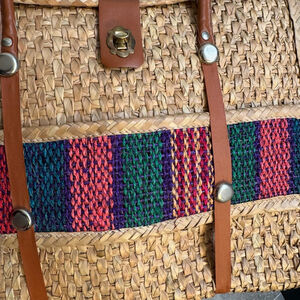 This is a pre-owned woven straw tote bag featuring brown faux leather handles and straps. The rectangular bag has a woven body and a colorful embroidered stripe across the front. The leather straps are attached with silver-tone metal hardware. It has a leather tab with a metal twist-lock closure. The straw shows some wear, consistent with age and use.