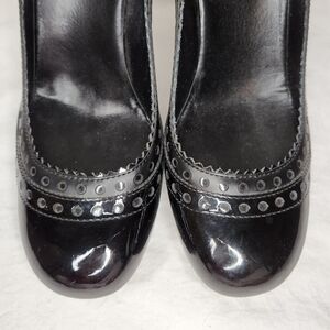 Black Brogue leather patent rounded toe high heel pumps with classic gold GG logo, by Gucci.