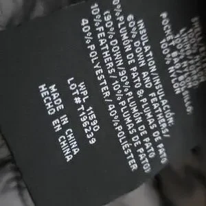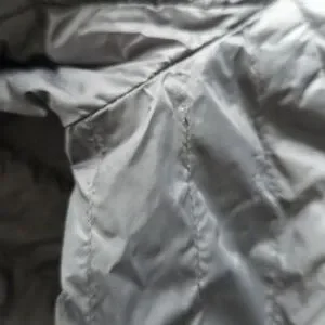 thigh length, lightweight,sleek, very packable, zip off removable hood, good condition!! small stitch snag upper left chest