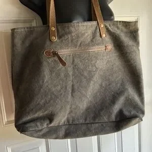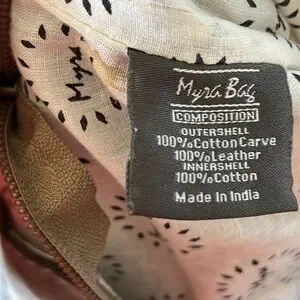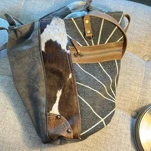 Myra bag π― leather and animal fur and one hundred π― cotton canvas back, generously sized bag with genuine hide leather side panels, leather straps and canvas back zip pocket front and back two cloth compartments and one zip inside made in India 19 inches wide 14 inches high and 4 inches bottom Check all pics. Come with any questions.