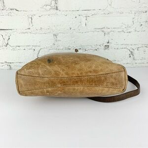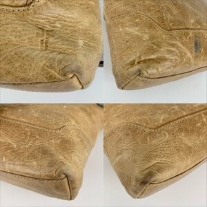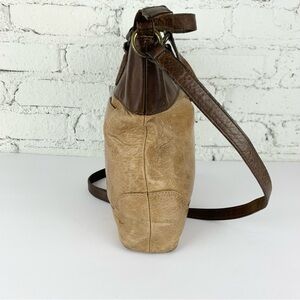 Brown two tone leather Melissa small crossbody tote bag by Frye. Two stains on the back and some staining on the inside lining near the zipper. Otherwise excellent condition. Please see all photos for details.