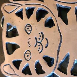 Charming copper cat trivet, copper tone metal exterior. This can be used as a trivet or hung on the wall as decor as there is a ring to use to hang on the back.