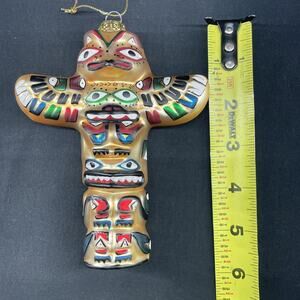Artisan Alaskan Totem Pole Glass Ornament 6" Hand Painted Gold Christmas Holiday