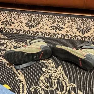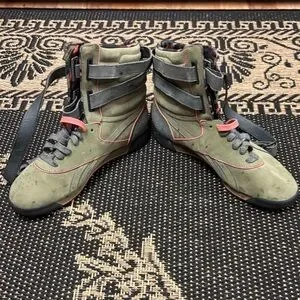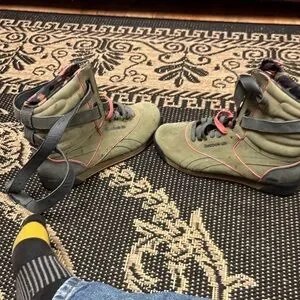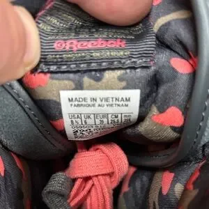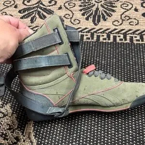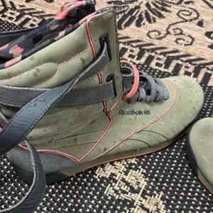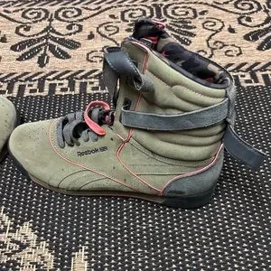 Reebok high-top sneakers with olive and coral accents. Features adjustable straps for a secure fit.