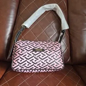 Stylish Versace shoulder bag with bold geometric design. Features a striking black and pink color scheme. Perfect for adding a touch of luxury to any outfit.