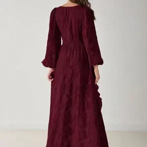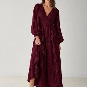 Elegant burgundy maxi dress showcases a flattering V‑neck, flowing lantern sleeves and a playful flounce hem that adds movement. Designed with a regular fit and an A‑line silhouette, the long length drapes gracefully for formal or evening occasions. Long sleeves provide modest coverage while the rich hue enhances any accessory, making it a versatile wardrobe staple.