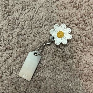 Stylish Coach keychain featuring a silver tag and a white daisy with a gold center. Perfect accessory for bags or keys.