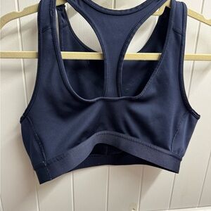 Navy sports bra with pink graphic design. Features artistic cheetah print. Ideal for active wear.