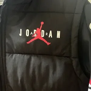 Sleek black puffer vest featuring a red Jordan logo. Includes a comfortable hoodie. Ideal for everyday style.
