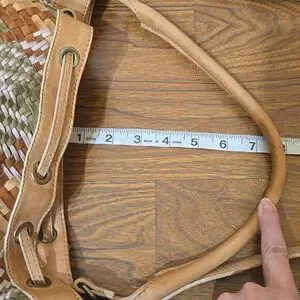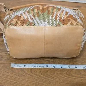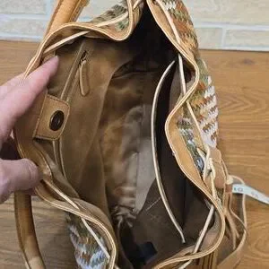 Beautiful artisan-style woven leather bucket bag featuring earthy tones of tan, sage green, and creamy white. Soft genuine leather with a flexible, slouchy shape and boho tassel detail. Adjustable/removable strap allows shoulder or crossbody wear. Perfect everyday statement bag with a natural, cottagecore aesthetic.