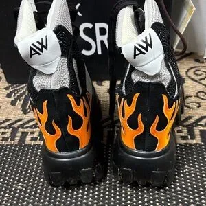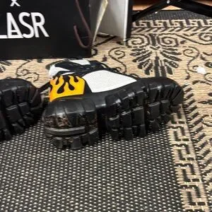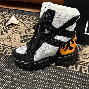Stylish high-top sneakers in black and white with flame details. Perfect for a bold look.