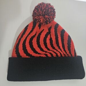 Black and red mixed pom-pom on top.