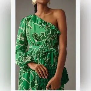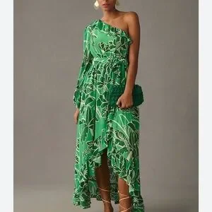 Introducing a stunning Anthropologie maxi dress from the Farm Rio collection that will make you stand out in any occasion. This floral printed one-shoulder dress features a beautiful ruffle accent that adds a fun and playful touch to the design. The dress is made of viscose and comes with a viscose lining, ensuring comfort and breathability. It is machine washable and perfect for travel, weddings, parties, or casual wear.