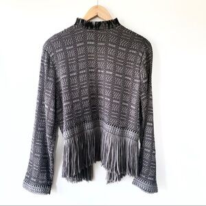 Chic gray blazer with fringe detail. Open front design. Perfect for layering.