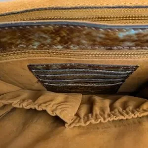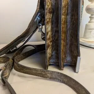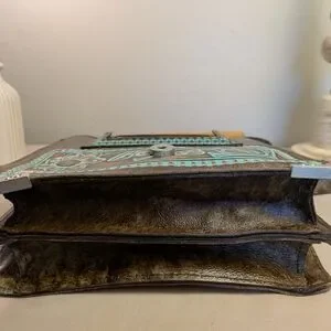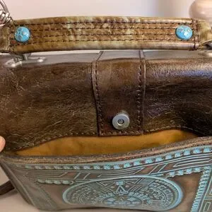 Design: The bag features intricate, handcrafted floral tooling with turquoise highlights. It has a top handle, a detachable crossbody strap, and metal corner accents.