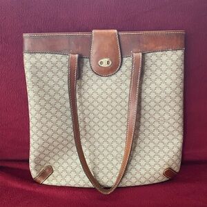 Celine Brown and Cream Patterned Tote Handbag / Purse with Brass Accent