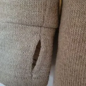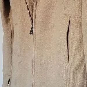 Stylish tan jacket with hood. Full zip closure. Comfortable and warm.