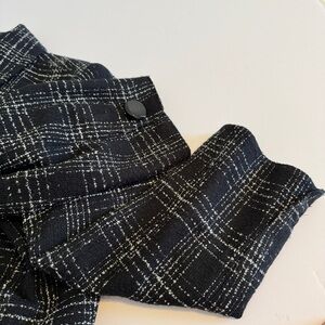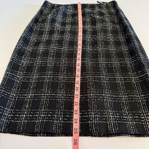 Suit Studio Size 8 tweed Blazer skirt set Button Collared Black White Womens Workwear. Measurements in photos. There is a button missing on the left side, but I don’t believe anybody would notice that price reflects flaw.