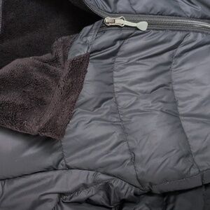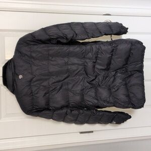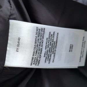 Black, down puffy coat. Seam by pocket coming loose to be a small hole, easy to fix with a couple of stitches (pictured). Size large.