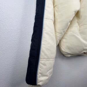 Kool! Brand Puffer Jacket / White medium weight nylon puffer jacket with high collar / Blue strip with teal piping running across shoulders and down sleeves / Full zip with buttons / Two waist pockets and one inside pocket
