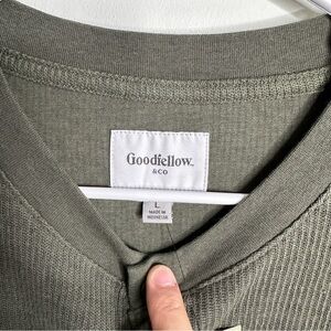 Casual olive henley shirt with button detail. Ideal for everyday wear. Goodfellow - Men’s Waffle Knit Long Sleeve Men’s Shirt - Size Large NWT. Excellent for Fall!