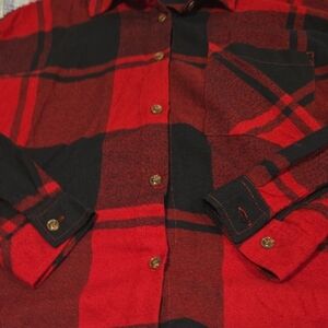 Stylish plaid shirt with a classic button-up design. Features a bold red and black pattern.