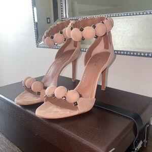 Chic Alaia heels in nude/pinkish suede. Features bold embellishments. Perfect for stylish outings. Timeless sandal by Alaia, and comfortable! Worn only once. Can be worn day/night.